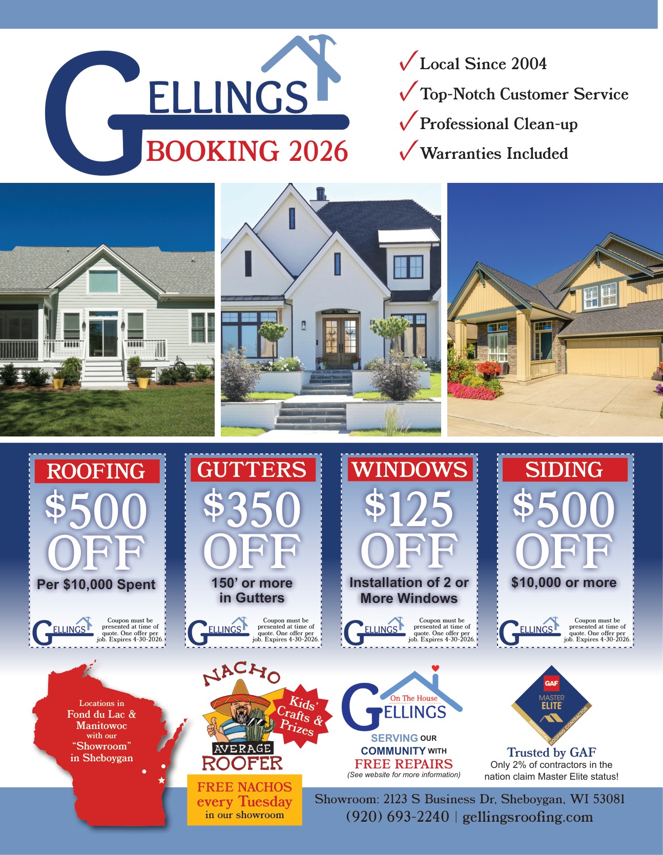 Local roofing, gutters, windows, and siding contractor in business since 2004. GAF Master Elite certified, serving the community with professional installation and clean-up services.