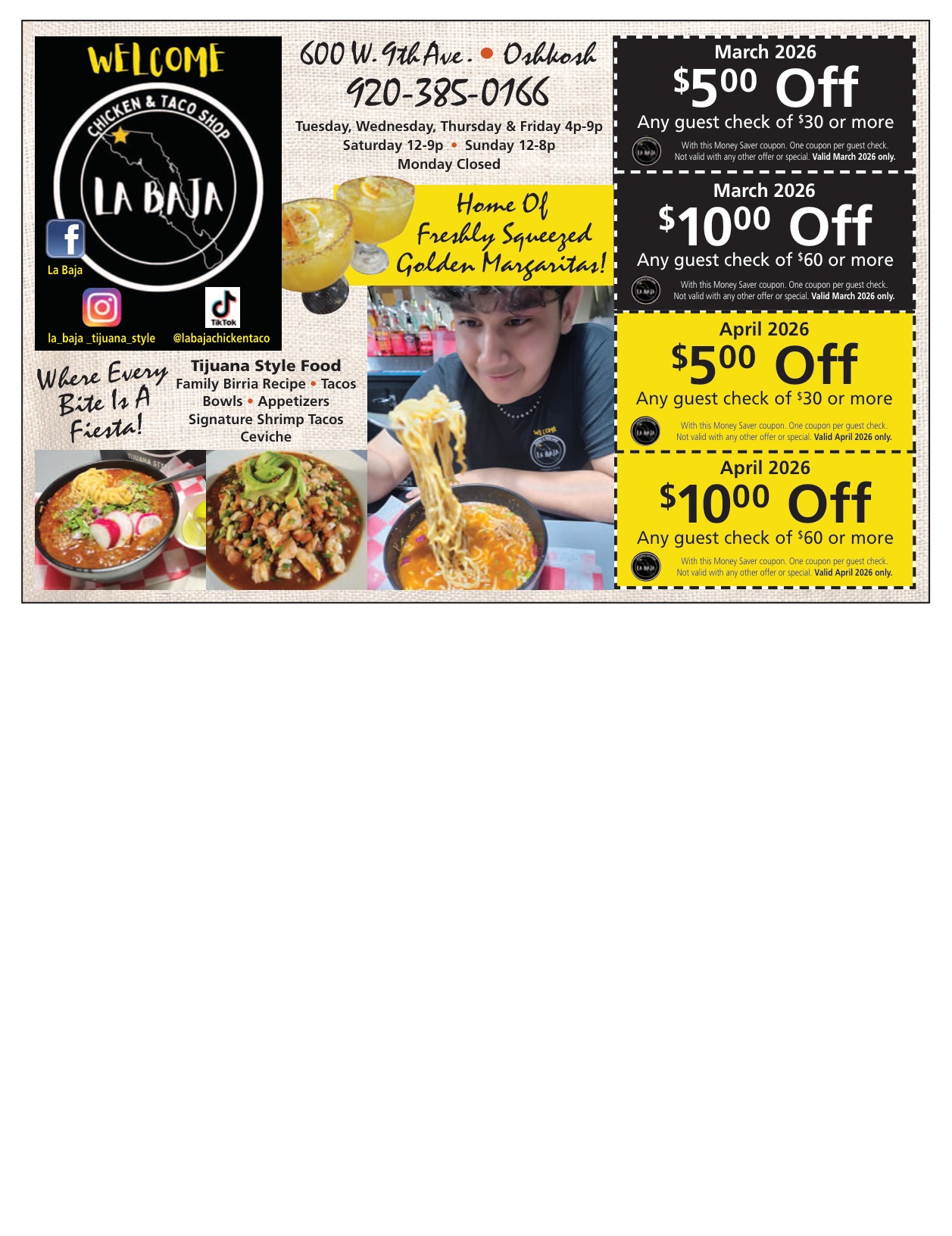 $5.00 Off Any guest check of $30 or more